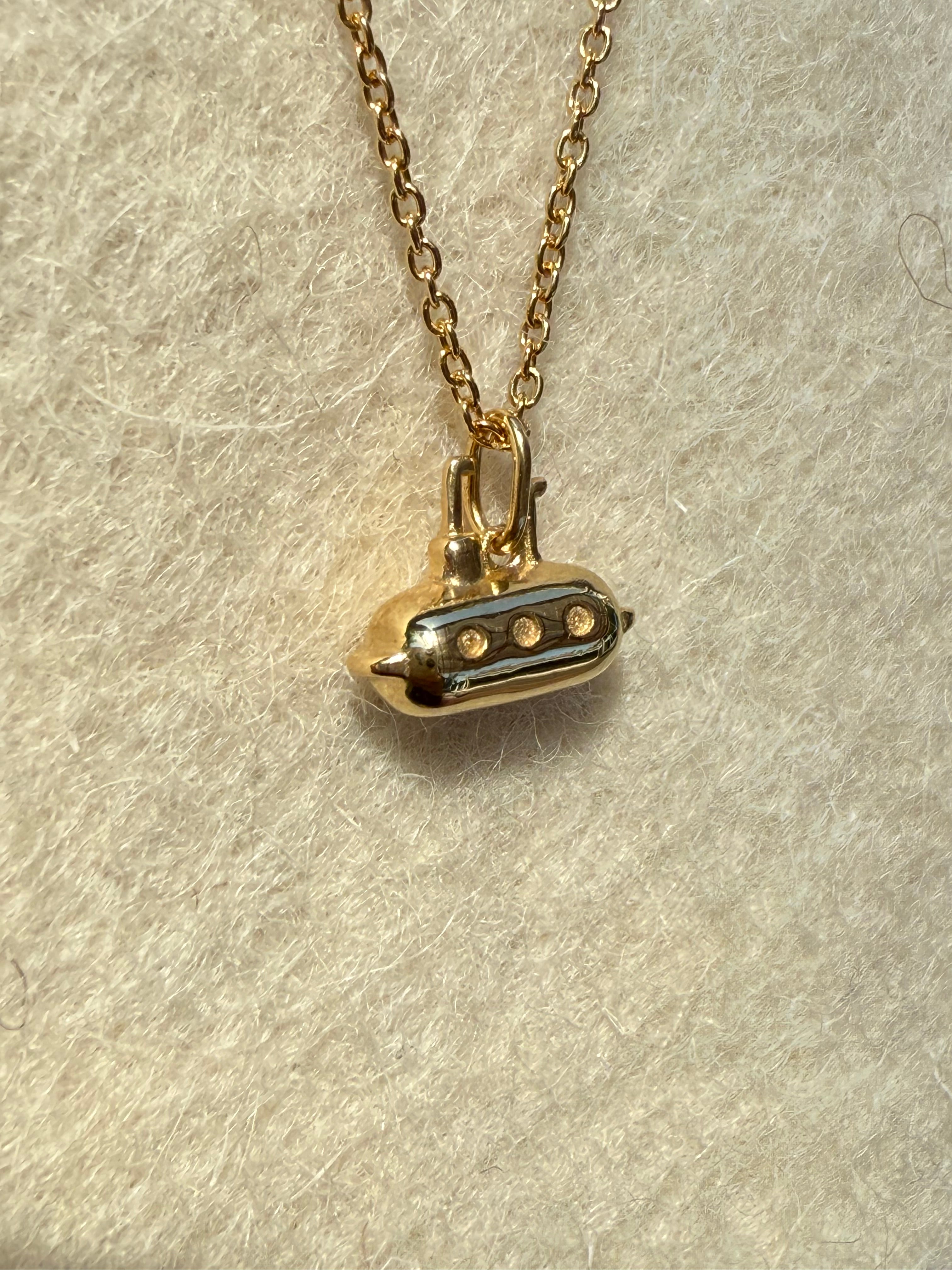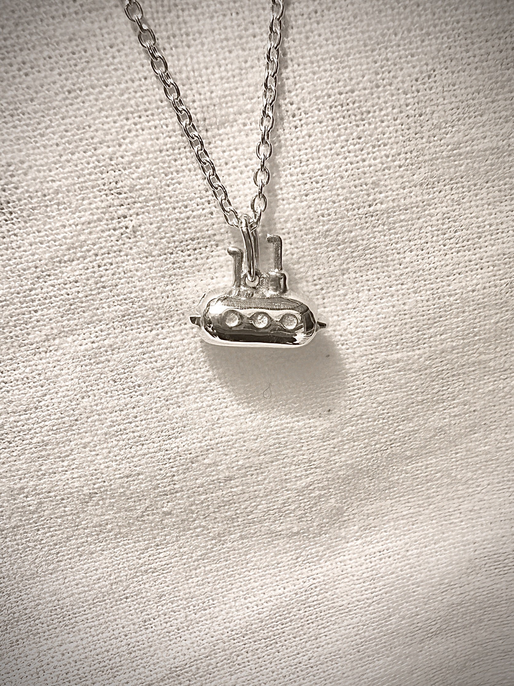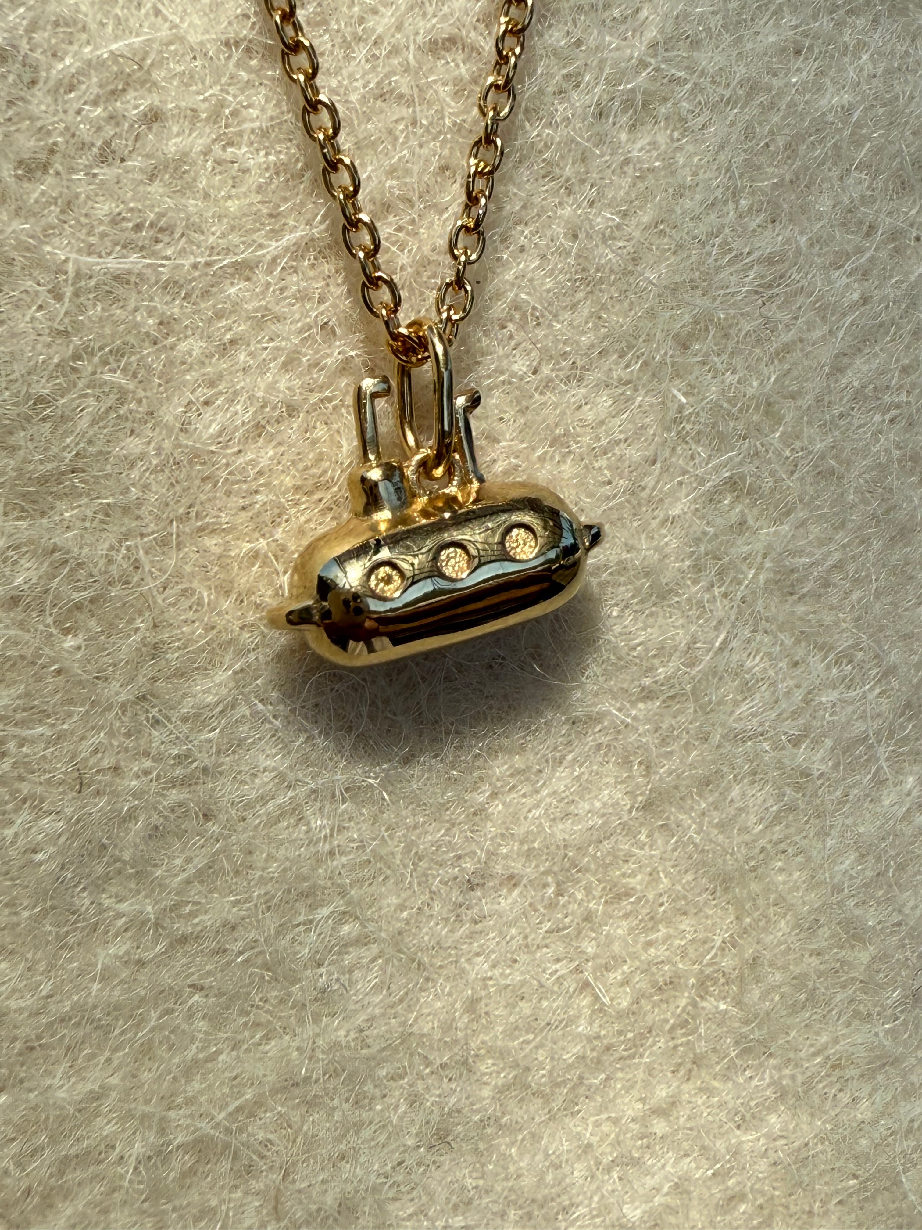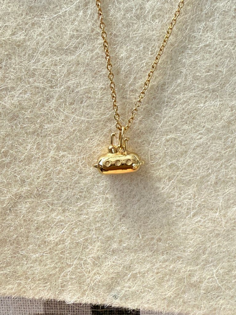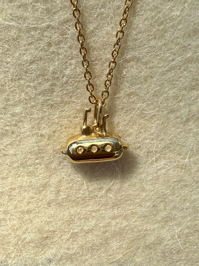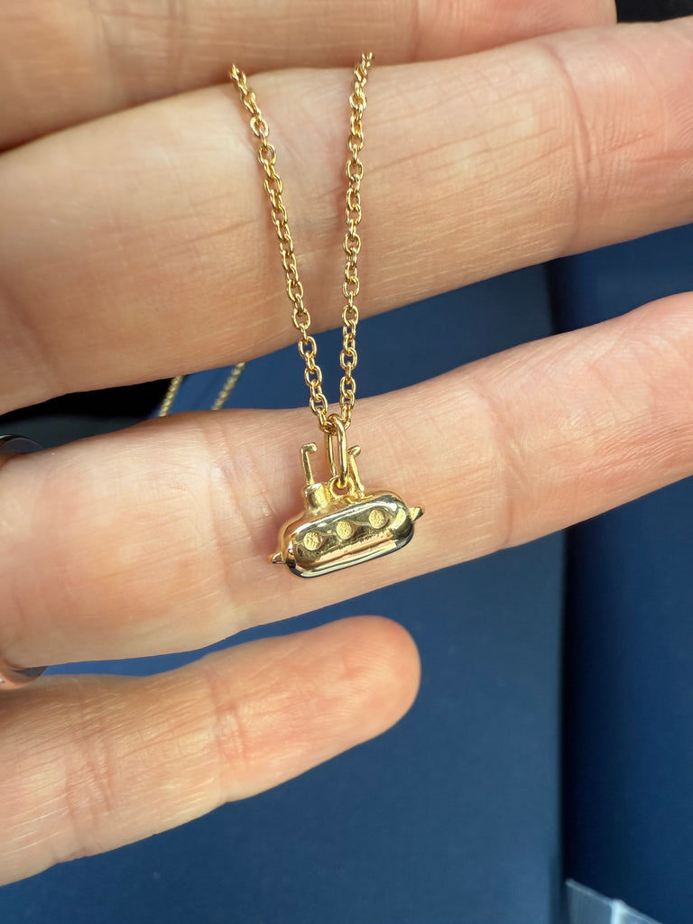 It measures 10mm in length on a fine 45cm cable chain. It comes on a necklace card with a photo of the original yellow submarine and a little blurb on the back in one of my branded pouches. Available in sterling silver, solid gold or gold plated sterling silver (vermeil).