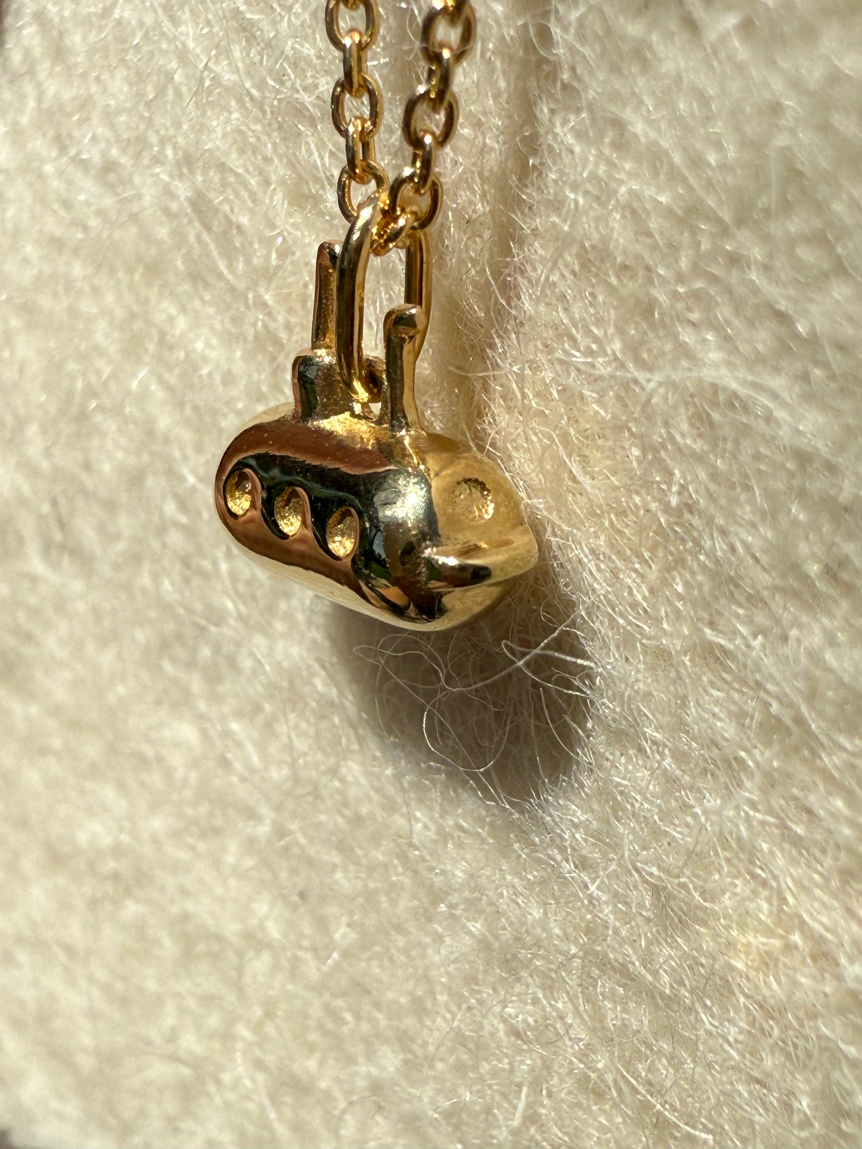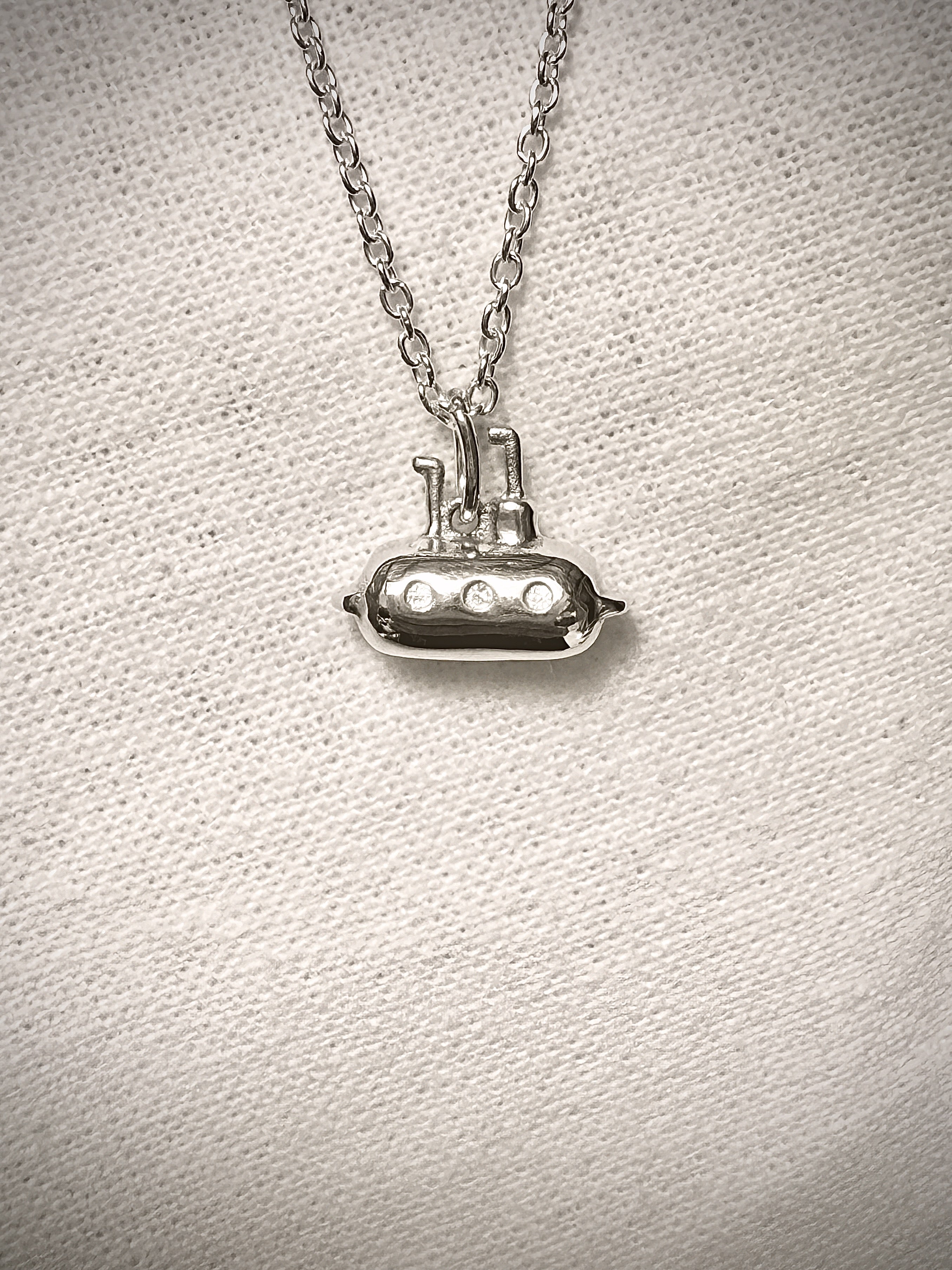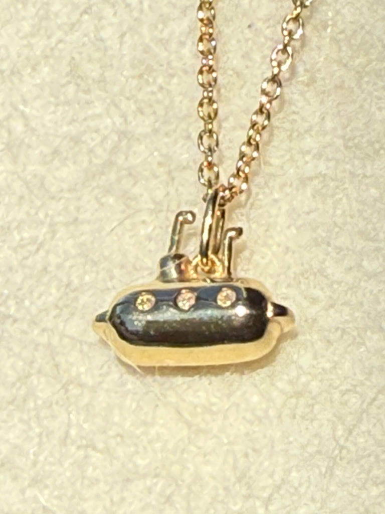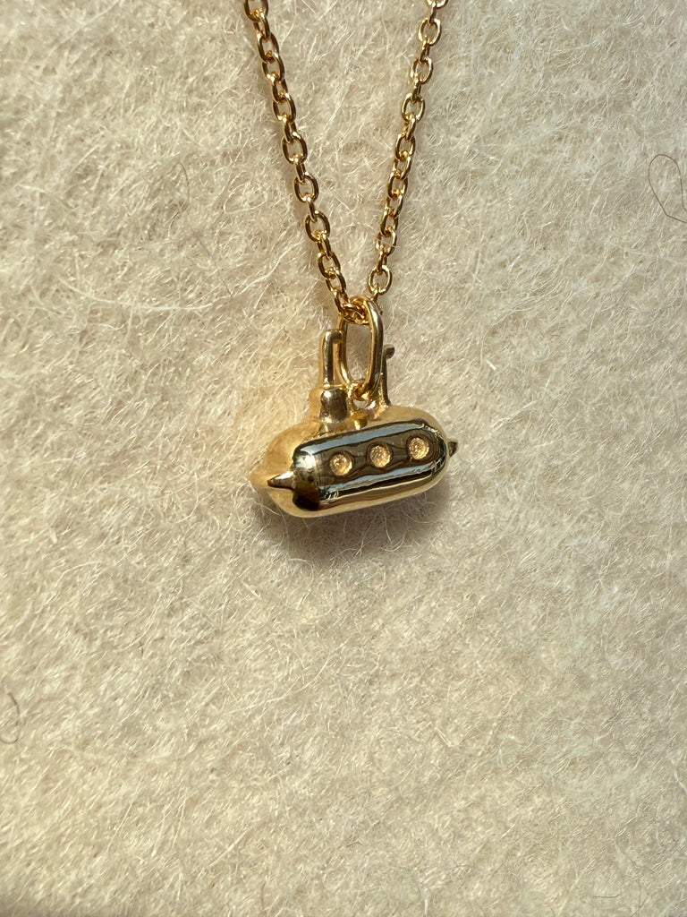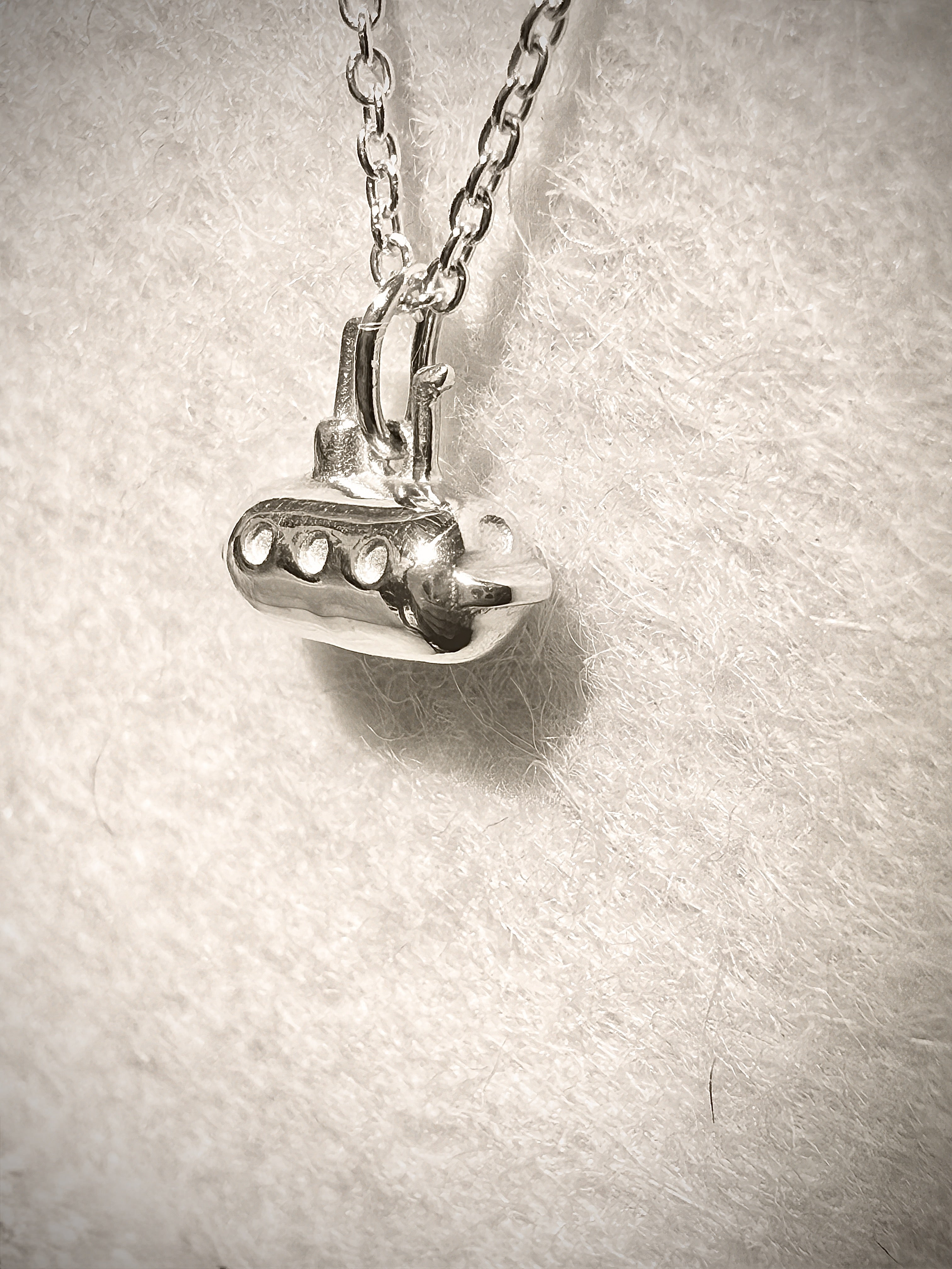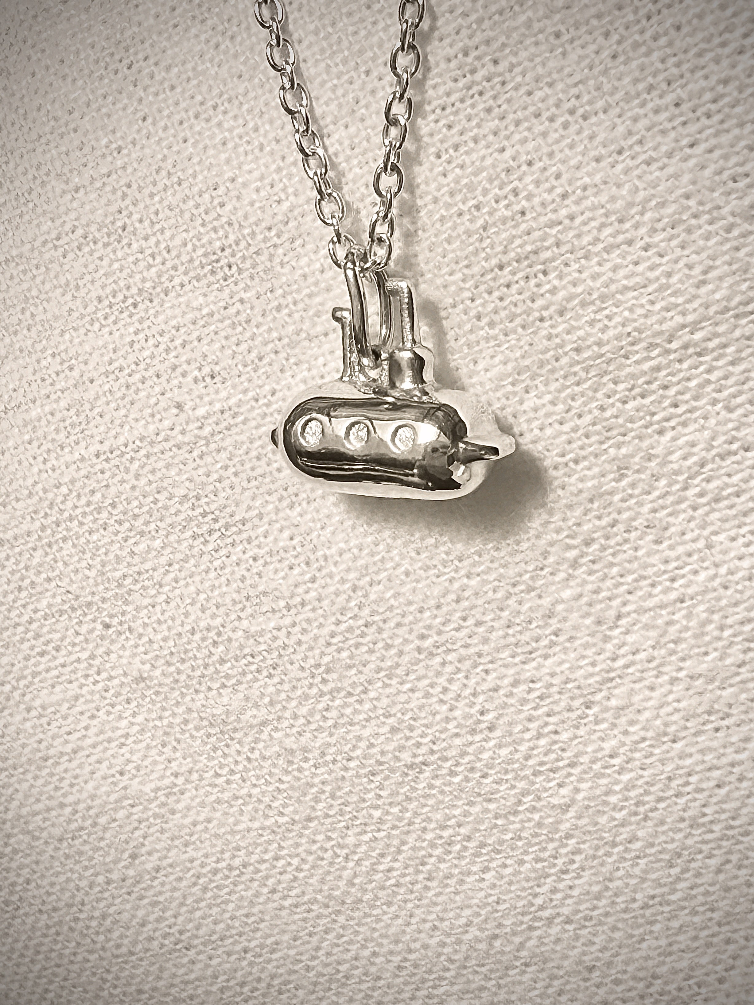 It measures 10mm in length on a fine 45cm cable chain. It comes on a necklace card with a photo of the original yellow submarine and a little blurb on the back in one of my branded pouches. Available in sterling silver, solid gold or gold plated sterling silver (vermeil).