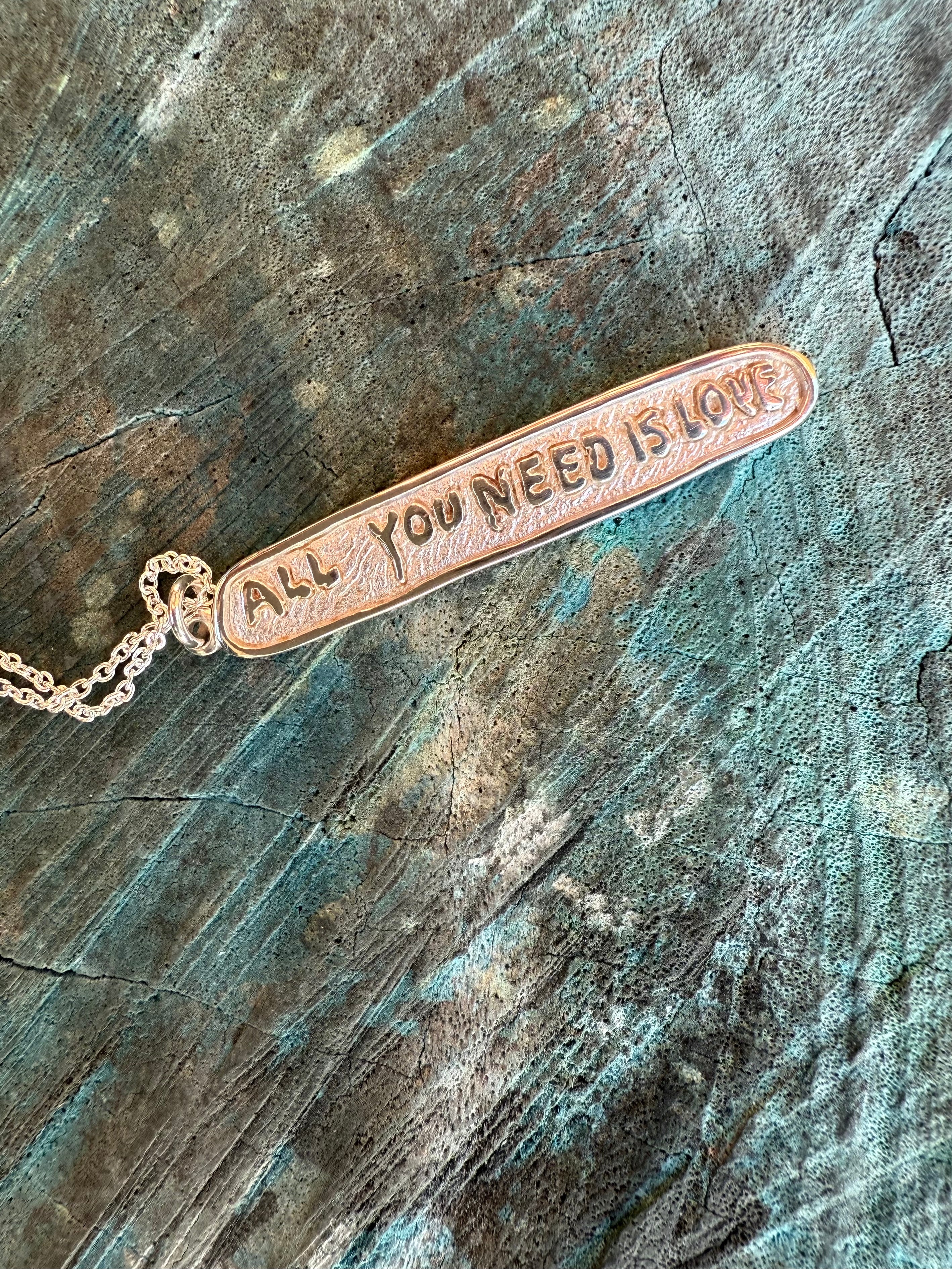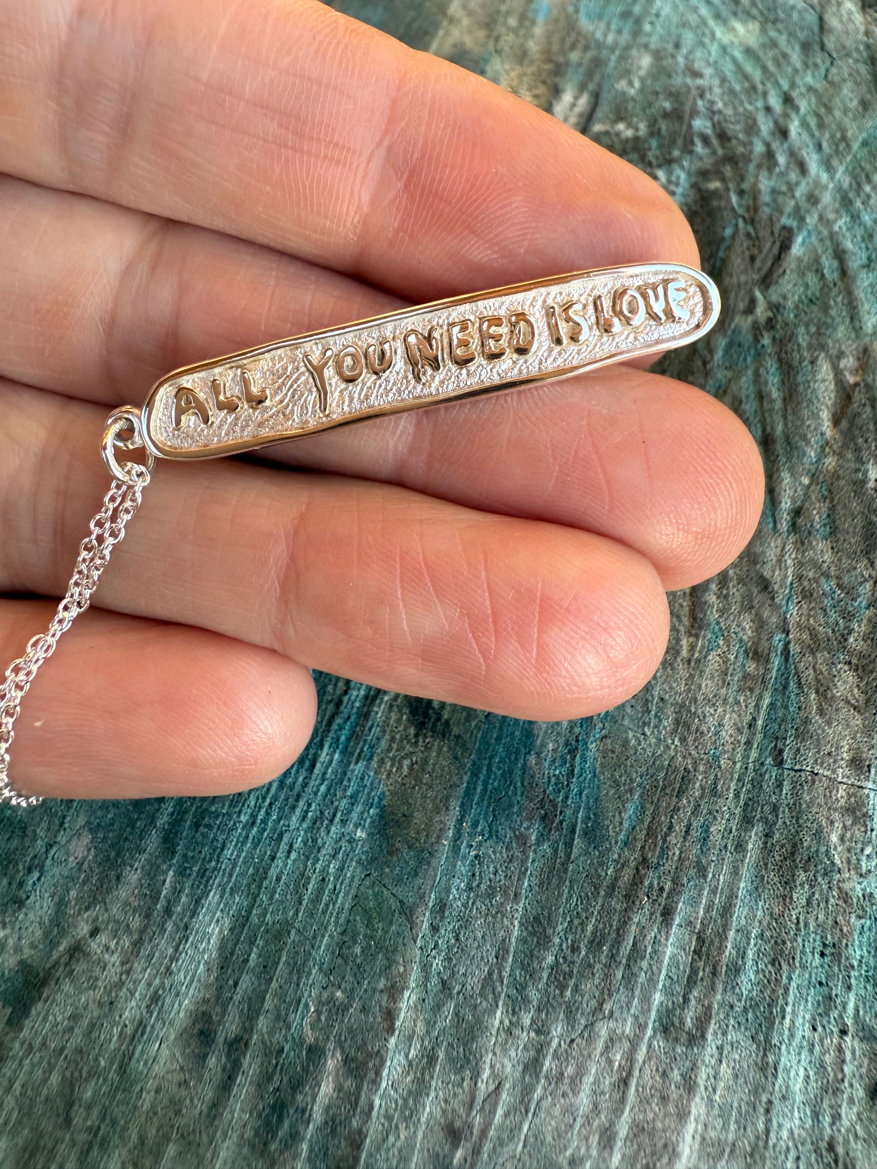 Inspired by the iconic All You Need is Love graffiti on Waiheke Island, this pendant is a tiny piece of local history you can wear close to your heart. Each one is hand-crafted in my garden workshop using traditional jewellery techniques, carved in wax then cast in sterling silver or solid gold and finished to a mirror shine.