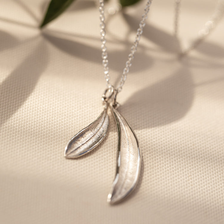 Two olive leaves from the same tree. Each stunning worn on its own but together the synergy they create is sublime.