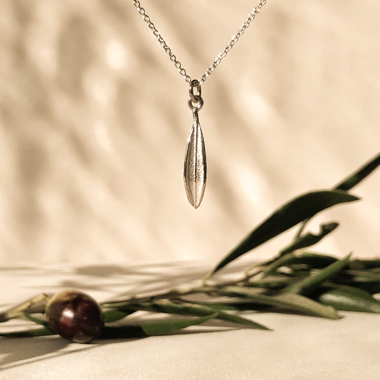 The sweetest solitary olive leaf on a fine cable chain. You'll never want to take this charming necklace off. The delicate pointed leaf sits beautifully on the neckline and is designed to wear short by itself or layer with longer chains. It is stunning in both silver and gold and adds a feminine touch to everyday wear.
